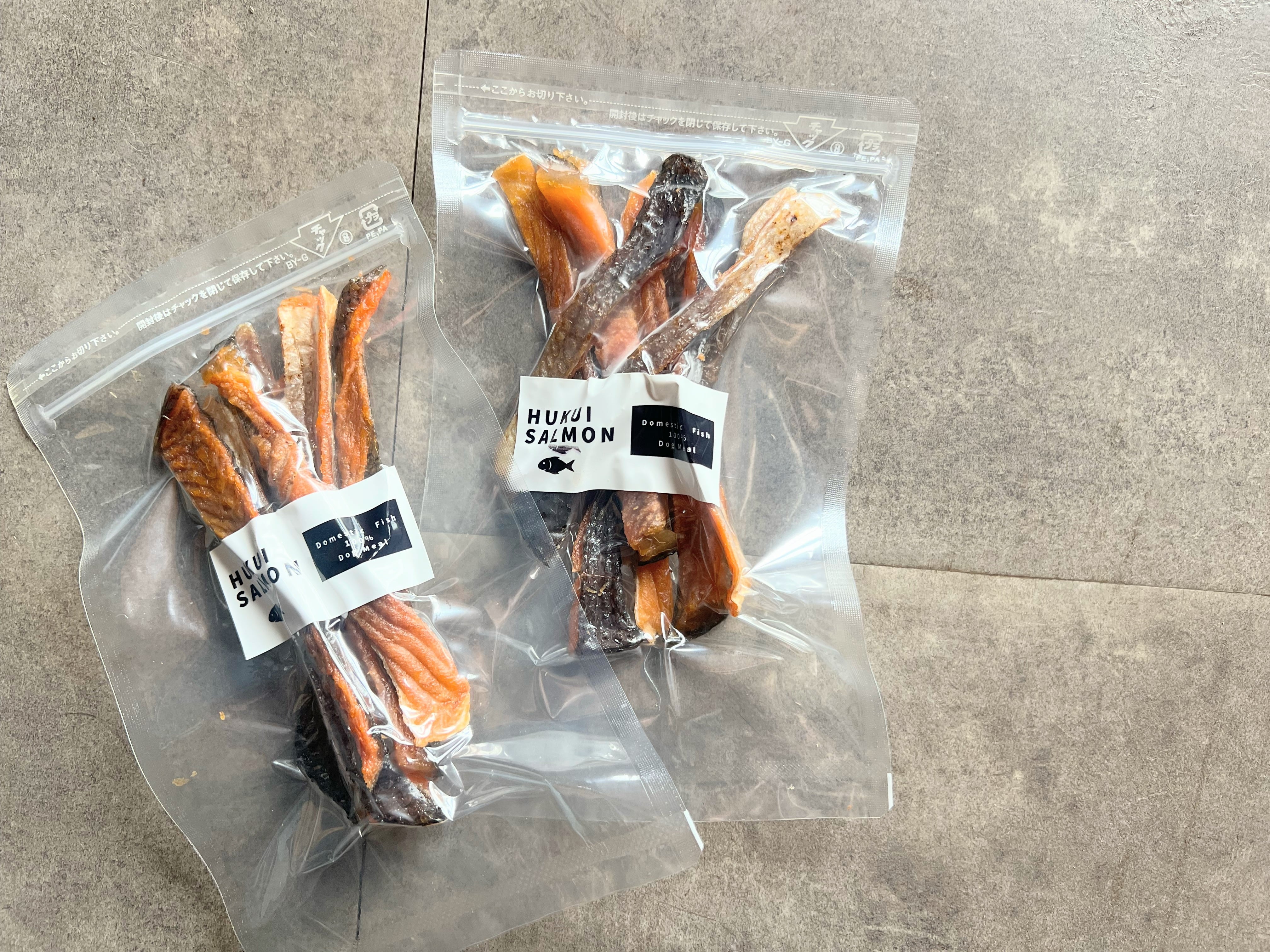 北陸・福井の清らかな海で育った「ふくいサーモン」を、わんちゃん猫ちゃんために食べやすい鮭とばスティックにしました